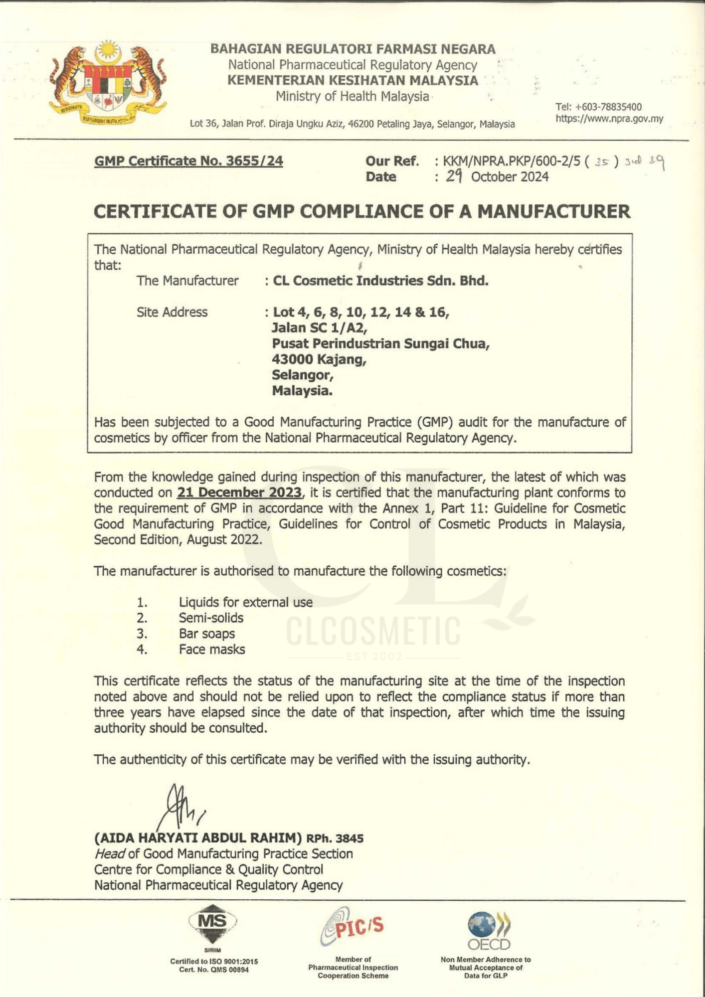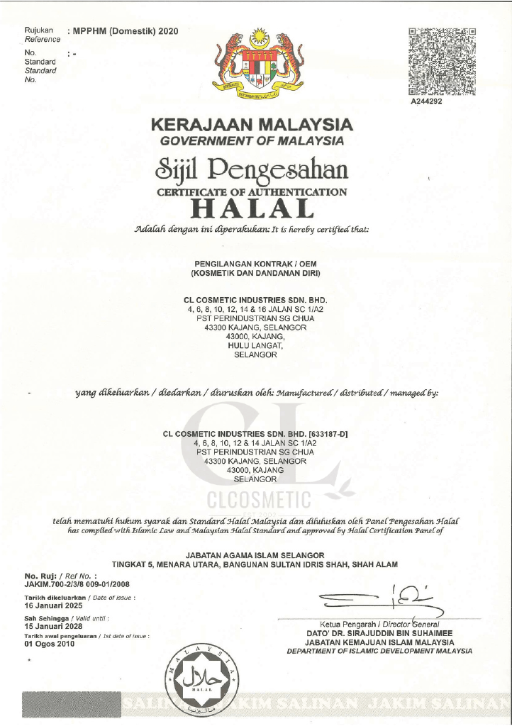 With CL Cosmetic Industries’ in-house R&D laboratory, GMP & HALAL certifications plus listed on the official directory of Malaysia’s National Pharmaceutical Regulatory Agency(NRPA) QUEST 3+ & commitment to innovation, CL Cosmetic Industries helps entrepreneurs and global brands create high-quality, customized cosmetic products that meet international safety and efficacy standards!